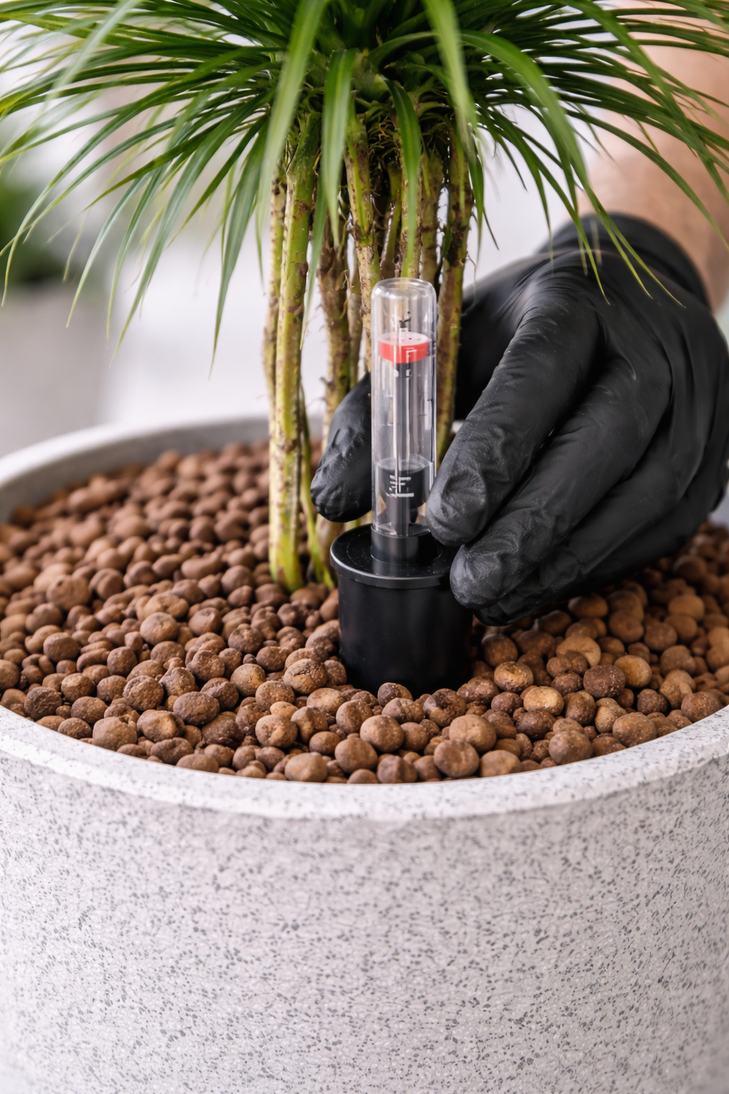 Hydrokultivierte Pflanzen wachsen nicht in Erde, sondern in einem mineralischen Substrat (z. B. Blähton). Die Wasserversorgung erfolgt über ein Reservoir im Gefäß – kontrolliert über einen Wasserstandsanzeiger. Das ist sauber, planbar und ideal für Innenräume wie Büro, Praxis, Hotel, Empfang oder Verkaufsfläche.